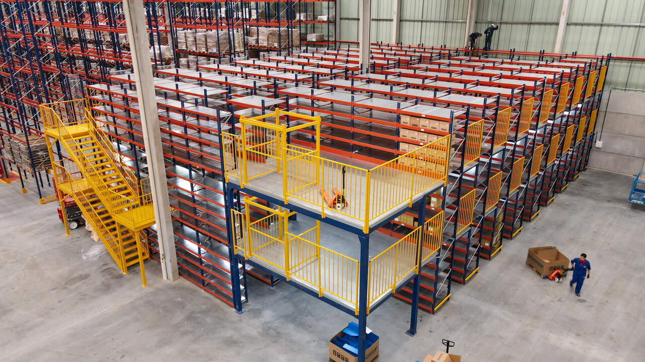 Aproveitamento máximo da altura do galpão com mezanino estrutural para armazenagem ou área de trabalho adicional.